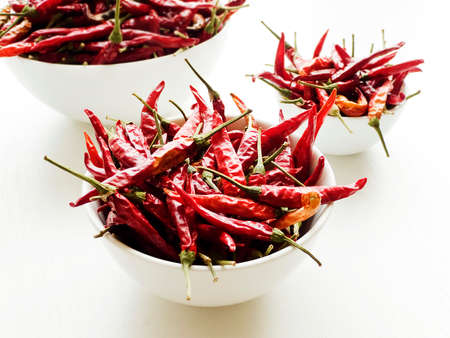 Dried red hot chili pepper in a bowl on the white background. Shallow dof.