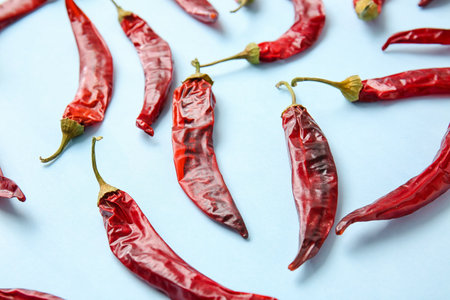 Dry hot chili peppers on color background