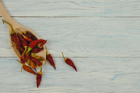 On a blue wooden background in a wooden spoon is dried red chili pepper. Space for text