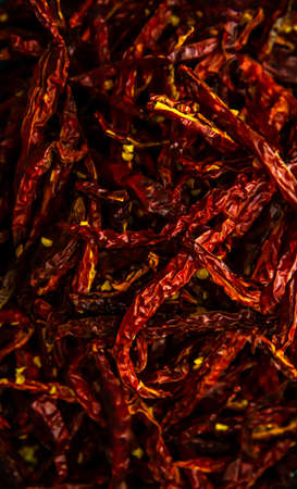 Dried vibrant hot peppers, food background with copy space