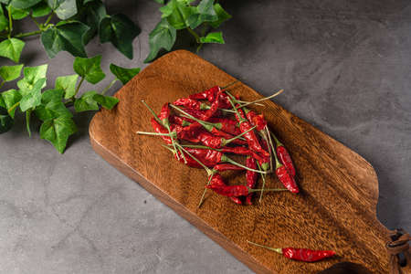 Dry red chili peppers on a wooden rustic table.
