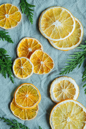 Homemade dried oranges slices from above Christmas natural and organic pattern decoration
