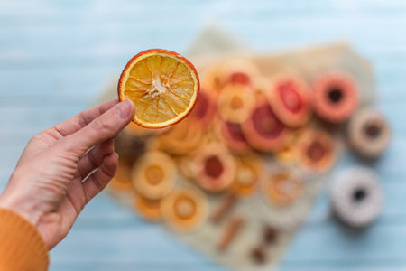 dried orange slice in a hand for diy projects, gift wrapping and beautiful eco Christmas decorations like wreaths, more decoration items arranged on a blue wooden table in the background