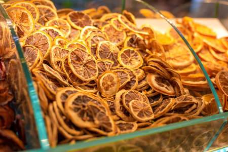 Dry lemon slices on the market or shop showcase.