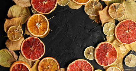 Banner of dried citrus, fruits sliced orange and tangerine, lime and lemon, kumquat and grapefruit slices , preparation for the celebration of Christmas, copy space
