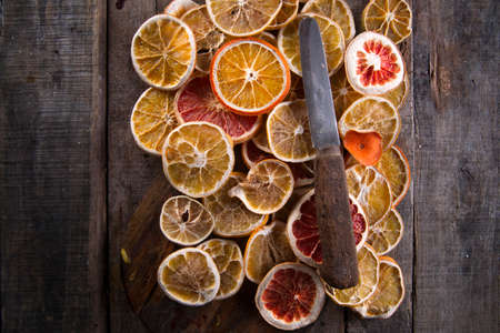 Slices of fresh dried lemon and orange lying on old rustic wooden background