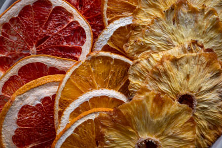 Close up of dried fruit slices texture. Dried orange, grapefruit, pineapples in a platel. Top view.