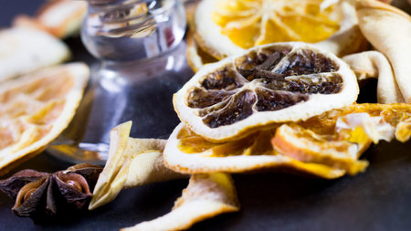 Dried citrus fruits and apple rings on rustic wood for the Christmas.Preparations for Christmas hot drinks.