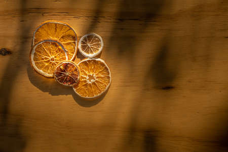 Top view of dried orange slices on side of wooden table. Subtle sunset lights and shadows.