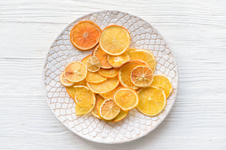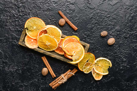 Organic homemade dried citrus chips slices in wooden plate on dark slate background