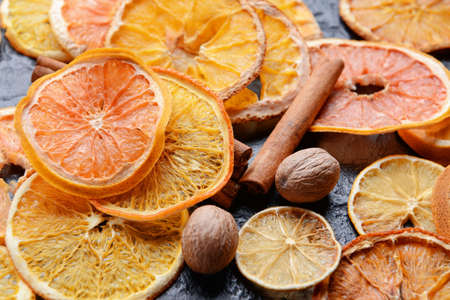 Dried slices of various citrus fruits closeup on dark background