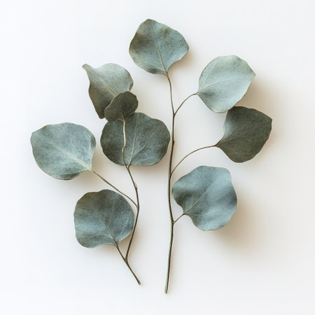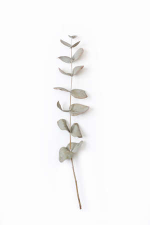 eucalyptus branch on white background, herbarium close-up, top view place for text. beautiful bokeh of plants