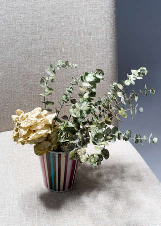 Fading flowers and eucalyptus branches. A bouquet of dying yellow roses against a brown background. selective focus.