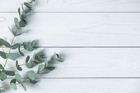 Top view image of eucalyptus composition on white wooden background .Flat lay