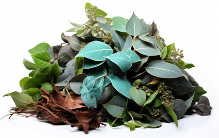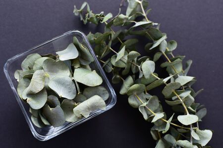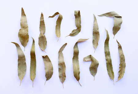 Eucalyptus or Eucalyptus (Eucalyptus) green dry leaves in corsage and loose on light background