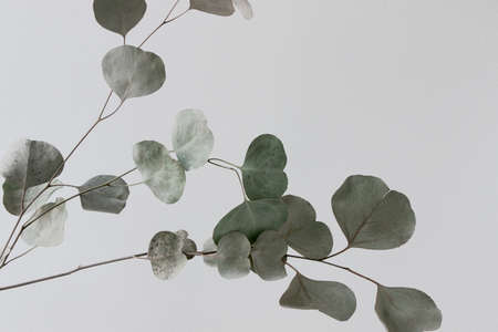 floristry minimalistic art. green eucalyptus twig on white background. nature and plants. copy space concept
