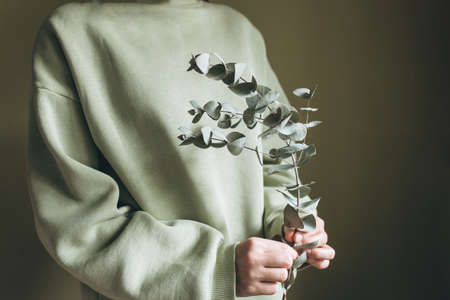 A woman holds a sprig of eucalyptus in her hands. Green monochrome, close-up.