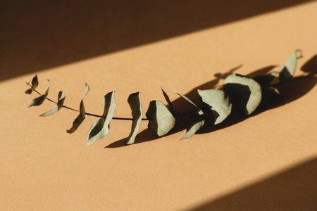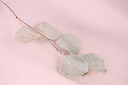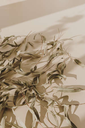 Dried tree leaves. Eucalyptus branch. Photo with single tree branch. Botanical photography on beige background.