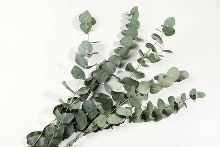 Green eucalyptus branches on a white background. Flat lay, top view.