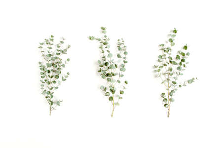 Green leaves eucalyptus isolated on white background. Flat lay. Directly above.