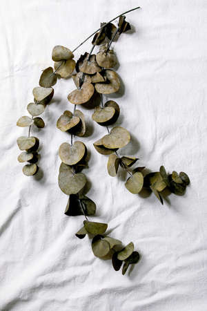 High angle view of green and brown eucalyptus leaves on white tablecloth