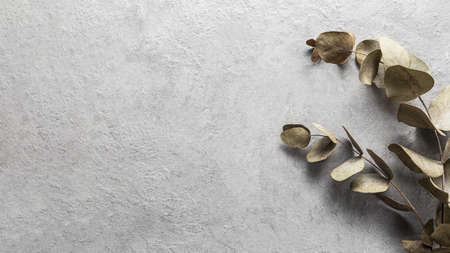 Eucalyptus green leaves and branch floral decoration on gray concrete wall background