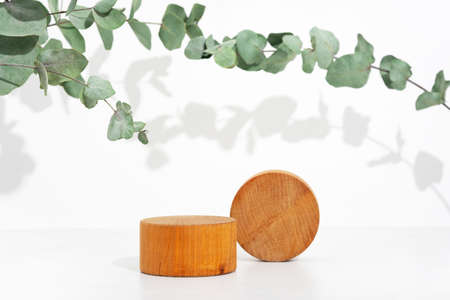 Wooden podiums with shadow of eucalyptus branches, hard light. White background for cosmetic products in eco style. Mockup.