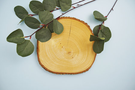 Top view of empty wooden cut with eucalyptus leaves on paper craft background. Mockup presentation for goods or cosmetics. close up.