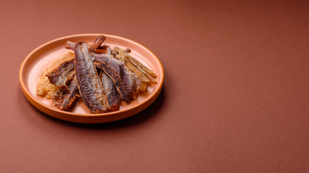 Dried salted fish as snacks or jerky, seafood as slices. Dried seafood snacks as a background for your design