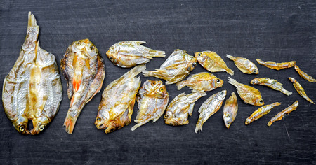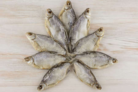 Dry fish on a wooden background large amount