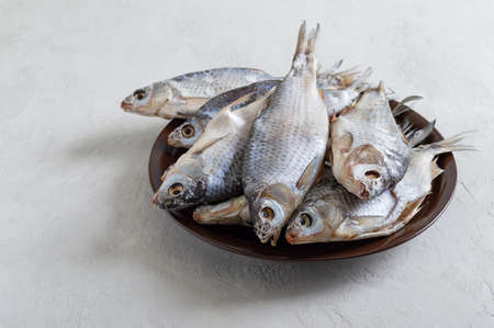 Salted or air-dried carp on a light concrete background. Traditional beer snack.