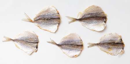 isolated close up top view dried salted caspian roaches fish on a white background