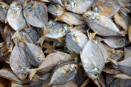 A pile of dried salted fish in a seafood market with selective focus