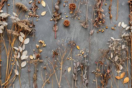Dry Plants Seamless Pattern, Decorative Twigs, Seeds and Flowers Top View, Dried Flowers Endless Tile, Copy Space, Generative AI Illustration