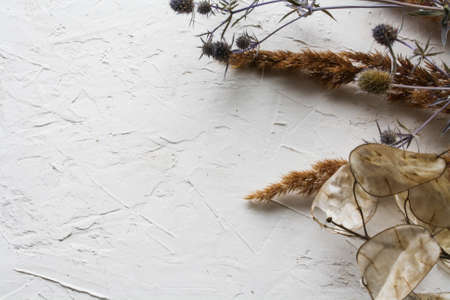A bouquet consisting of wild herbs, spikes, spines, located on a white textured background