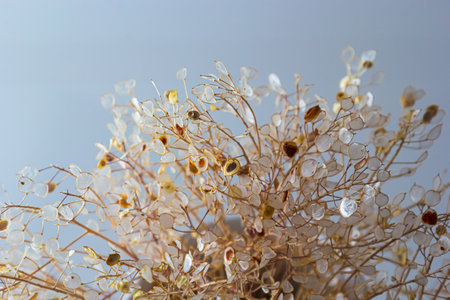 Dried seed heads and crumbling petals exhibit intricate textures and shapes, showcasing nature's elegance in a serene setting.