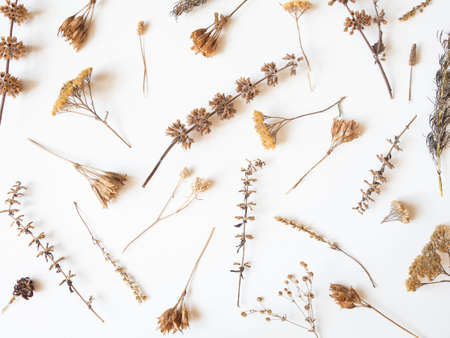Autumn composition of dried different plants and flowers on white background. Top view. Flat lay