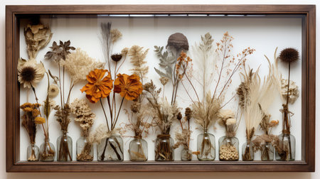 A collection of dried flowers is displayed against a soft light background. Various textures and shapes create a natural and calming atmosphere, perfect for home decor.