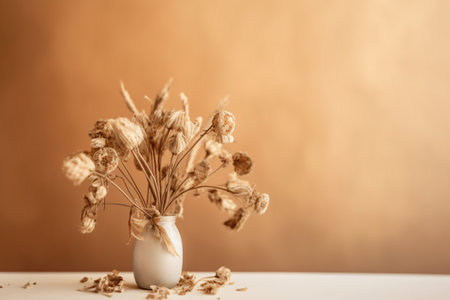 Dried flowers in soft hues of cream and brown are displayed artistically against a light neutral background, creating a serene and inviting ambiance in the room..