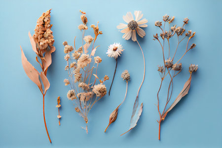 Floral composition dried flowers pattern on blue background, top view, flat lay, natural ornament layout for text. Generative AI