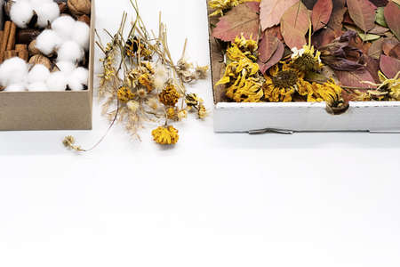 Workplace for hand crafting, hobbies or DIY. Natural materials, dried leaves, flowers in boxes on white table.