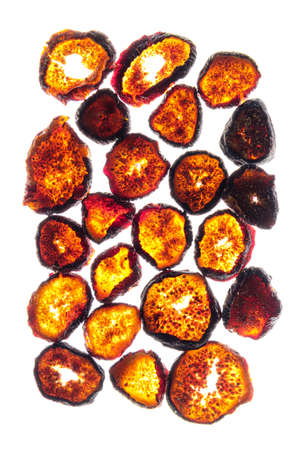 top view of dried plum slices isolated on a white background with copy space