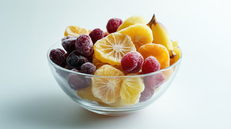 A glass bowl showcasing freeze-dried fruits like pineapples, cherries, and figs, against a clean white setting.