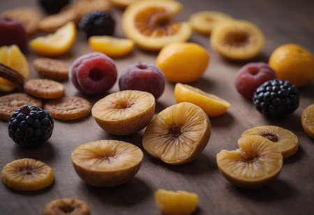 AI generated dried fruits on a wooden table. Close-up, selective focus.