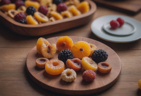 Closeup of various dried fruits on wooden plate, selective focus. Generated by AI