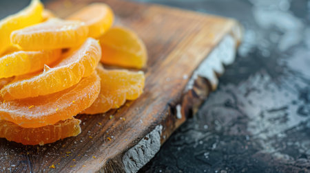 Glistening candied orange slices on a rustic wooden board with a dark background