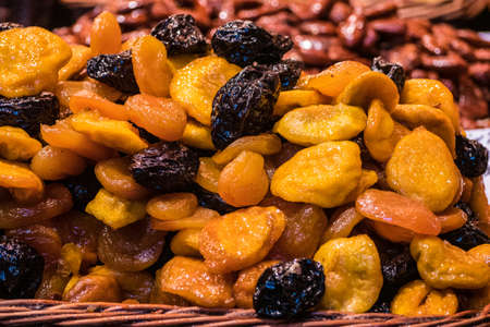mix of dry fruits and nuts, prunes, dried apricots, apples, raisins, background
