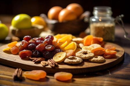 AI Generated. Assorted dried fruits arranged on a wooden background