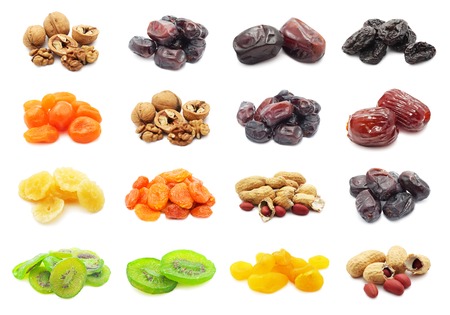 Assorted dried fruits, isolated on a white background. Healthy eating concept, top view, close up
