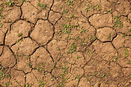 Ground texture with cracks and grass, land without water, top view